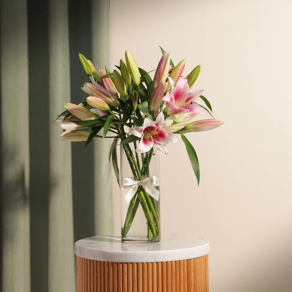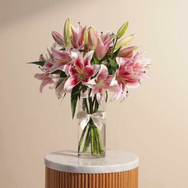 أضف لمسة من الأناقة والبهجة إلى أي مكان مع هذا التنسيق الرائع من زهور الليلوم الوردية الراقية، المعروضة بشكل جميل في مزهرية زجاجية أسطوانية أنيقة. يشع هذا التنسيق دفئًا ورقيًا، مما يجعله الهدية المثالية لأي مناسبة. سواء كان للاحتفال بلحظة خاصة أو لإضاءة يوم شخص مميز، سيضيف هذا التنسيق الزهري البسمة والسرور. فاجئ من تحب بهذا التنسيق الرائع من الليلوم الوردي، الذي يجسد جوهر الجمال والرقي. اطلب الآن ودعهم يستمتعون بجمال أزهار الطبيعة الخلابة!