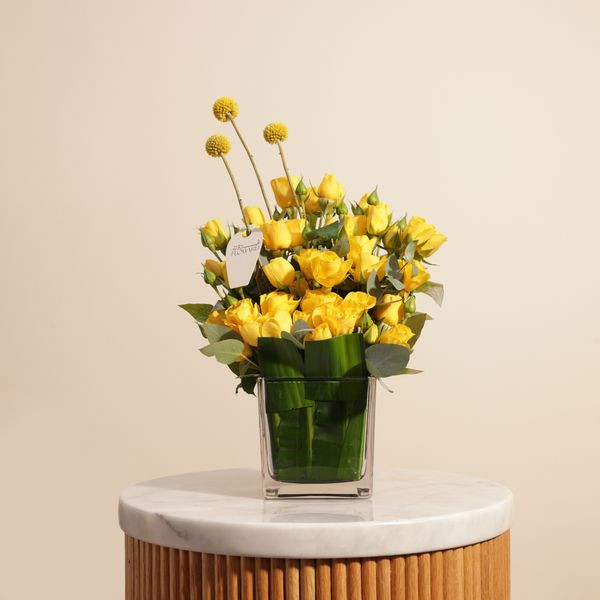 انشر السعادة والإيحابية مع تنسيق زهور "الشمس المشرقة" التي تتميز بورود البيبي جوري المبهجة باللون الأصفر ، والكراسبيديا الغريبة أيضًا باللون الأصفر النابض بالحياة، ولمسة الأوكالبتوس العطرية. تم ترتيب هذه المجموعة بعناية في مزهرية مربعة معاصرة، وهي تشع بالدفء والبهجة. يضيف عطر بيبي جوري لمسة من الحلاوة، يكملها الكراسبيديا المرحة والأوكالبتوس المنعش. مثالي لإضفاء البهجة على أي غرفة أو إرسال رسالة سعادة، هذا الترتيب المنسق بعناية يجسد جمال الطبيعة. احصل على دفقة من أشعة الشمس في الداخل مع هذه الشاشة الساحرة التي تجسد جوهر الفرح والإيجابية.