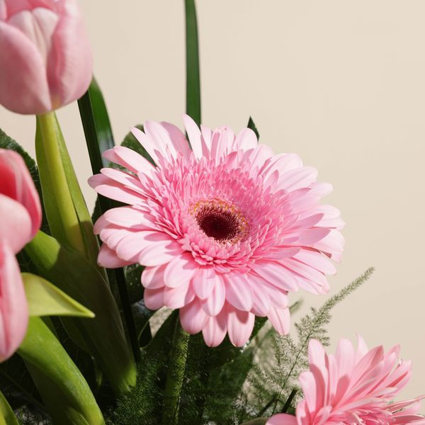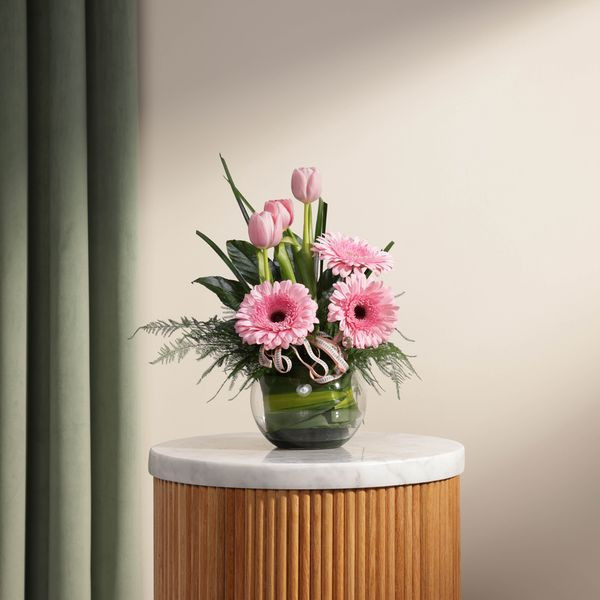 تخيل جمال مزهرية منسقة بدقة تضفي لمسة راقية على أي مكان تزينه. هذه المزهرية هي هدية مميزة لأحبائك تعبر عن مشاعر التقدير والاهتمام بأناقة فائقة. تضم هذه التحفة الطبيعية توليب وردي وجربارة وردية، تتمايل بين أوراق أراليا الخضراء، وعشب أخضر، وأغصان الدراسينا المنعشة، مع لمسة من الهليون الأخضر تضفي حيوية لا تُضاهى. تأتي هذه التوليفة الرائعة داخل مزهرية زجاجية دائرية تضفي مظهرًا عصريًا وجاذبية لا تقاوم. لا تنتظر كثيراً، اطلب الآن واجعل هديتك تلامس قلوب أحبائك برقة وعذوبة.